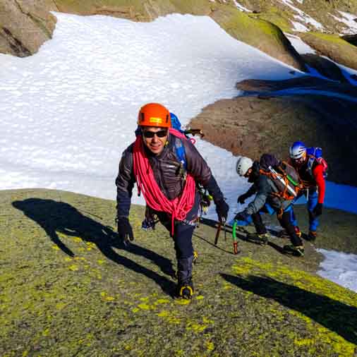 En este Curso de Iniciación al Alpinismo pretendemos daros los conocimientos técnicos y logísticos necesarios para planificar y acometer con seguridad y autonomía ascensiones clásicas en alta montaña invernal en las cuales serán necesario un uso correcto de piolet y crampones, así como el uso puntual de la cuerda para proteger algunos pasos o descender. También os enseñaremos a realizar una correcta interpretación del medio, sus riesgos objetivos y subjetivos.